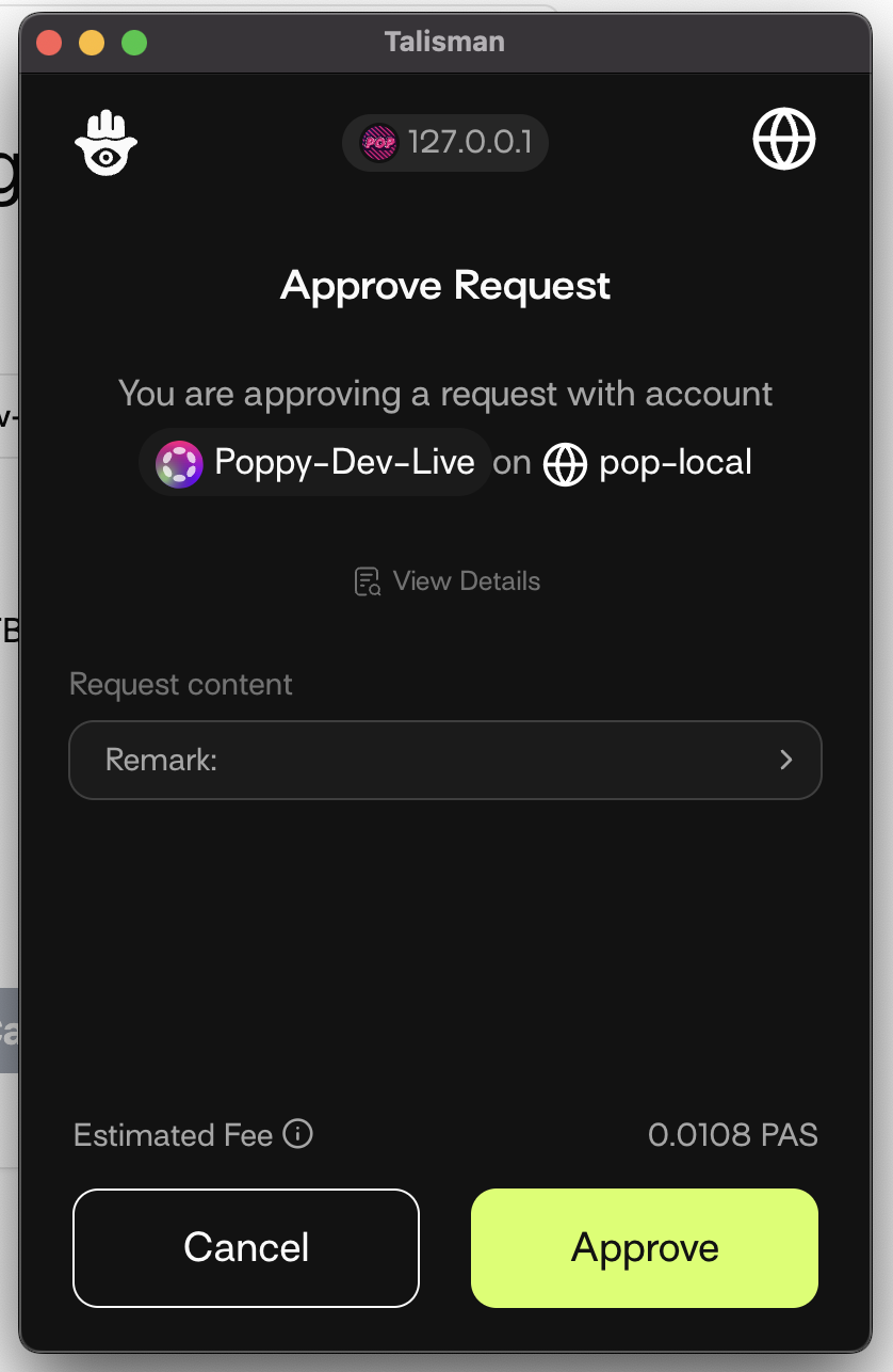 pop call chain --pallet System --function remark --args "0x11" --url ws://localhost:9944/ --use-wallet --skip-confirm◇ Wallet signing portal started at http://127.0.0.1:9090.