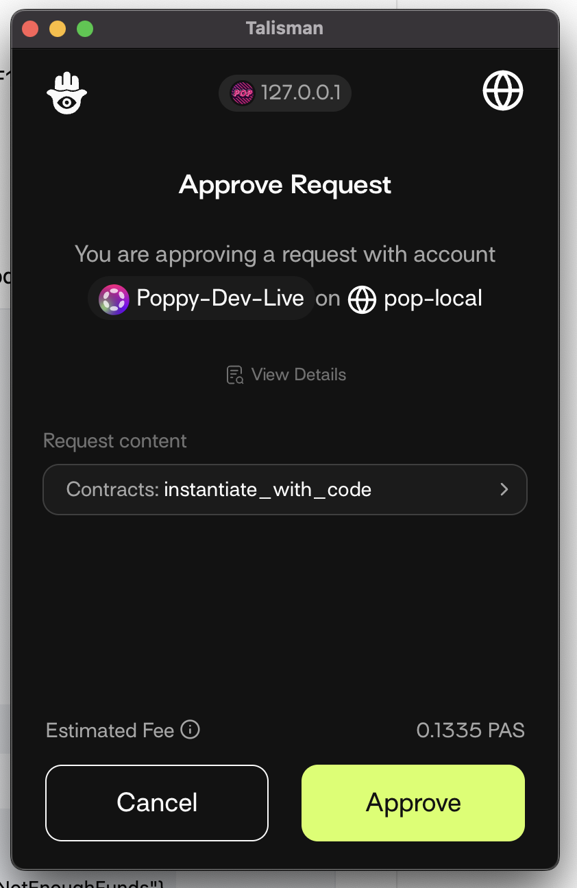 Normally, you would provide `--suri=<private-key>` to interact with the chain. However, this implies a potentially insecure way of handling private keys and should only be used for development accounts. For production accounts and more secure signing, Pop CLI provides the `--use-wallet` option that you can use.